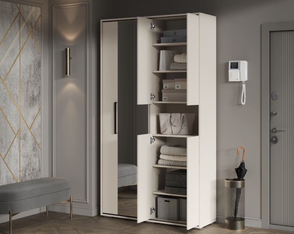 - Разделение на секции: Одна часть прихожей включает две одинаковые секции с полками, закрытые створками. В каждой секции предусмотрено по две съёмные полки, что позволяет настраивать пространство под ваши нужды. Открывание створок осуществляется за выступ, что делает использование шкафа более удобным.