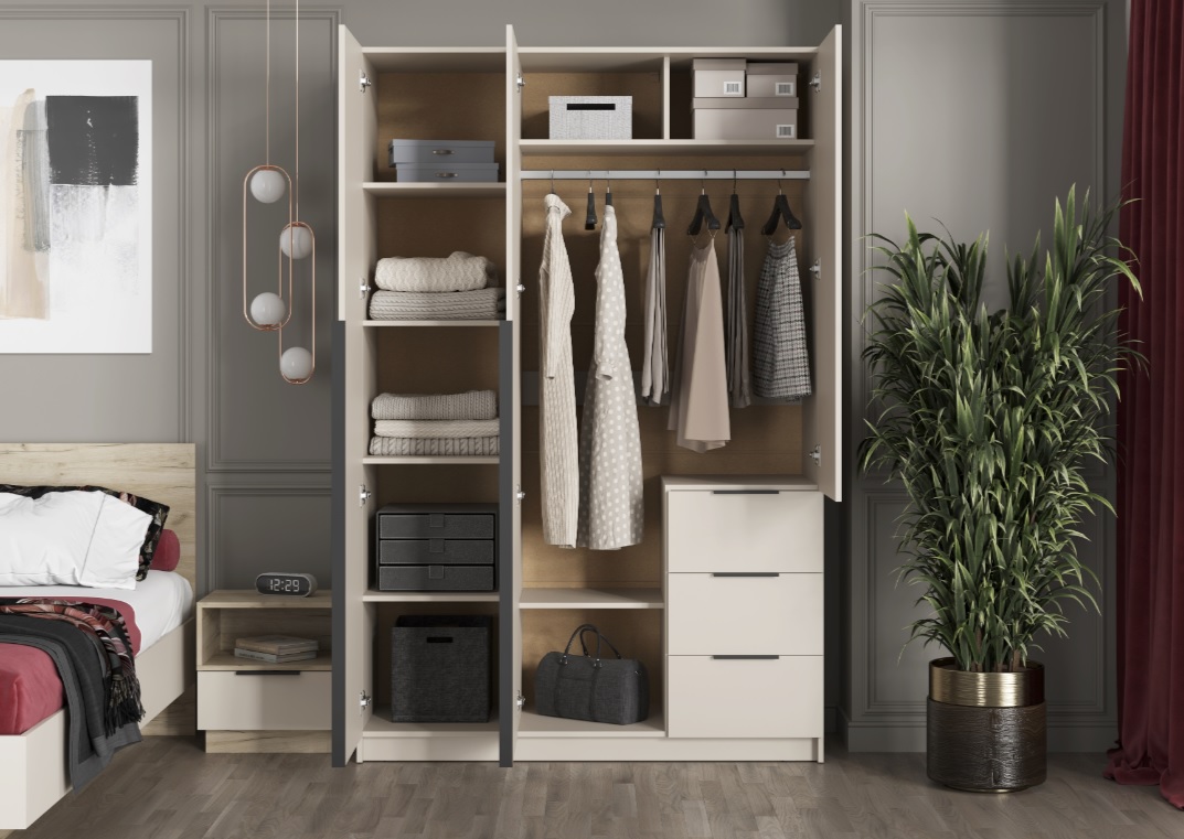• Удобное разделение пространства: Две левых и одна правая створки обеспечивают различные варианты хранения.